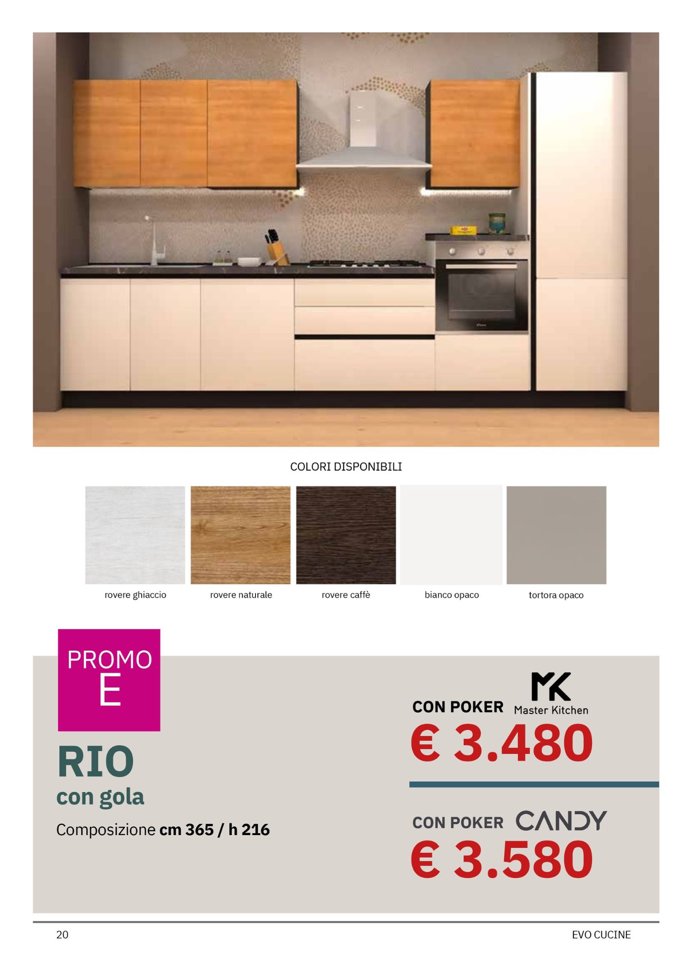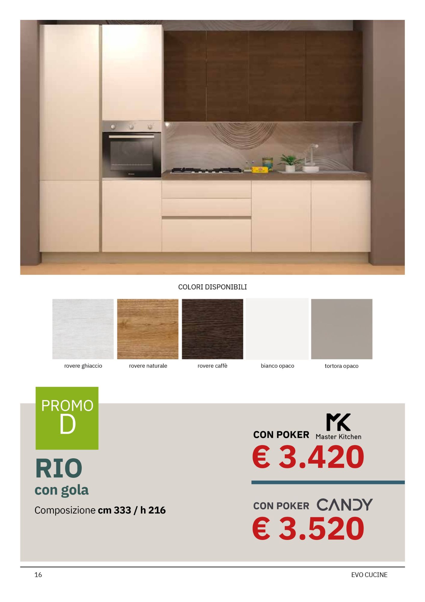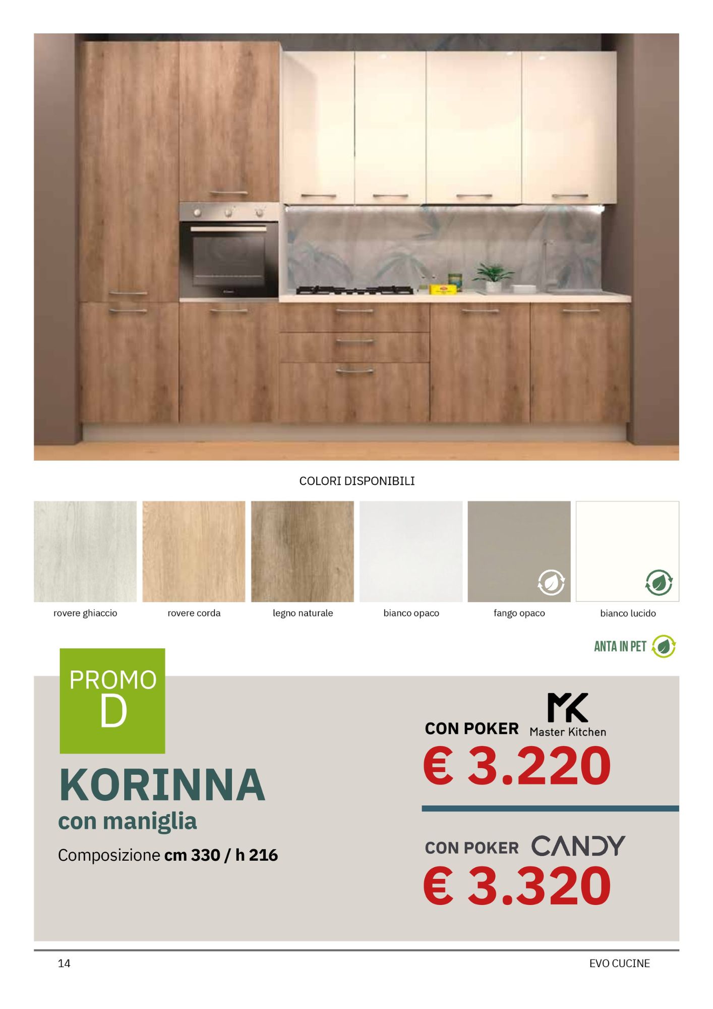 Da Mobili Rossetti, rivenditore Evo Cucine, puoi approfittare di offerte speciali su quattro modelli bloccati Evo, suddivisi tra due linee principali: Korinna e Rio, ciascuna proposta in due varianti (Promo D e Promo E), per rispondere a diverse esigenze di spazio e stile.