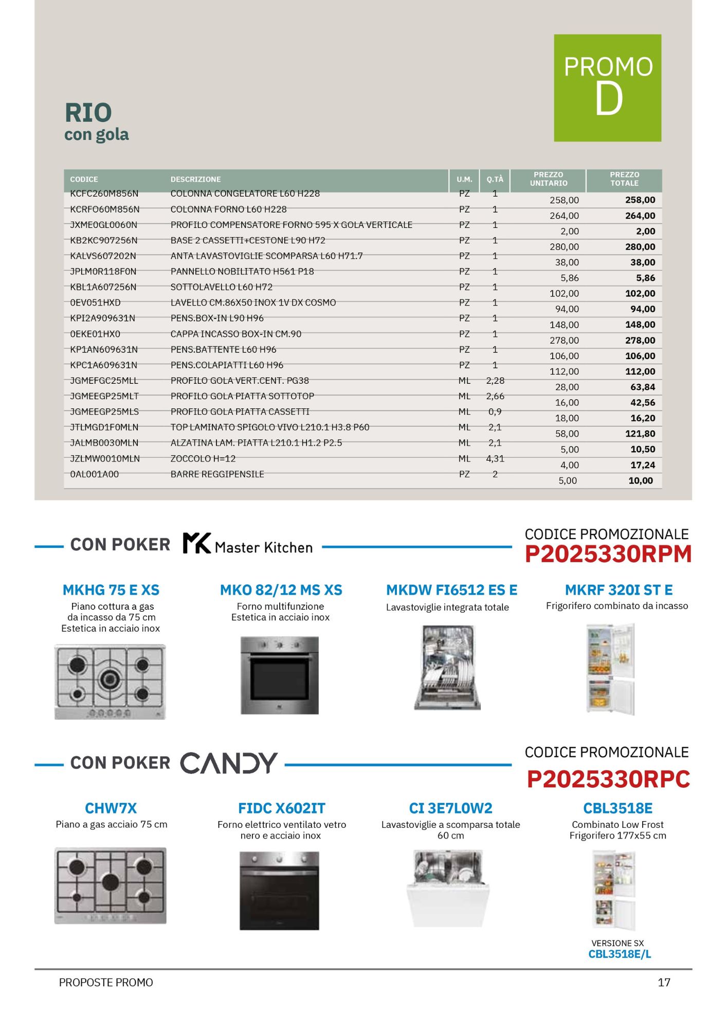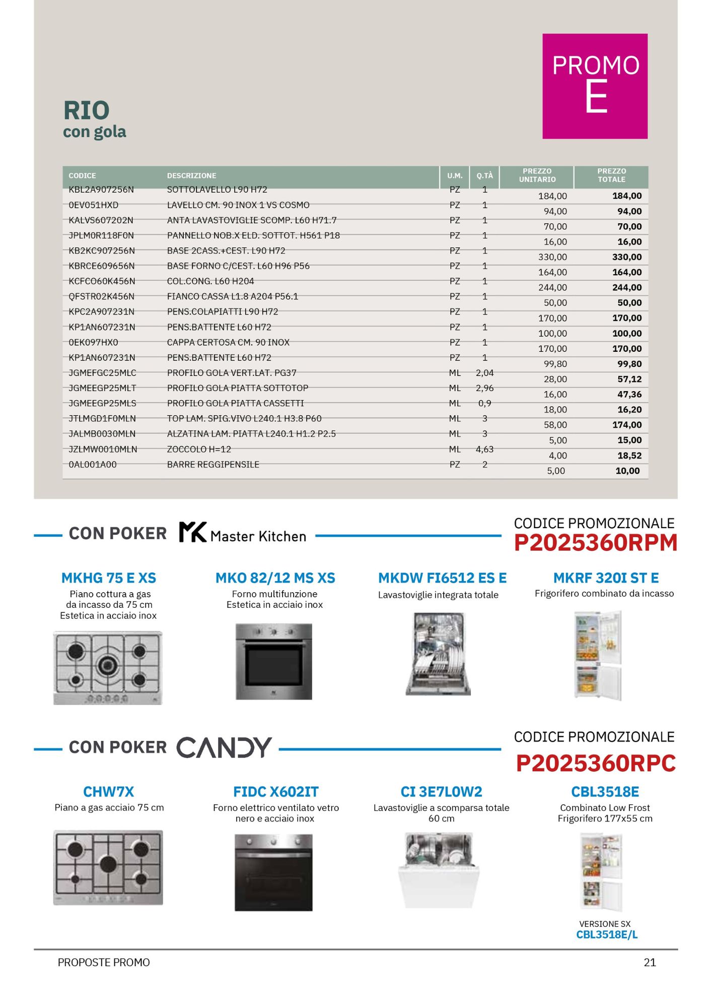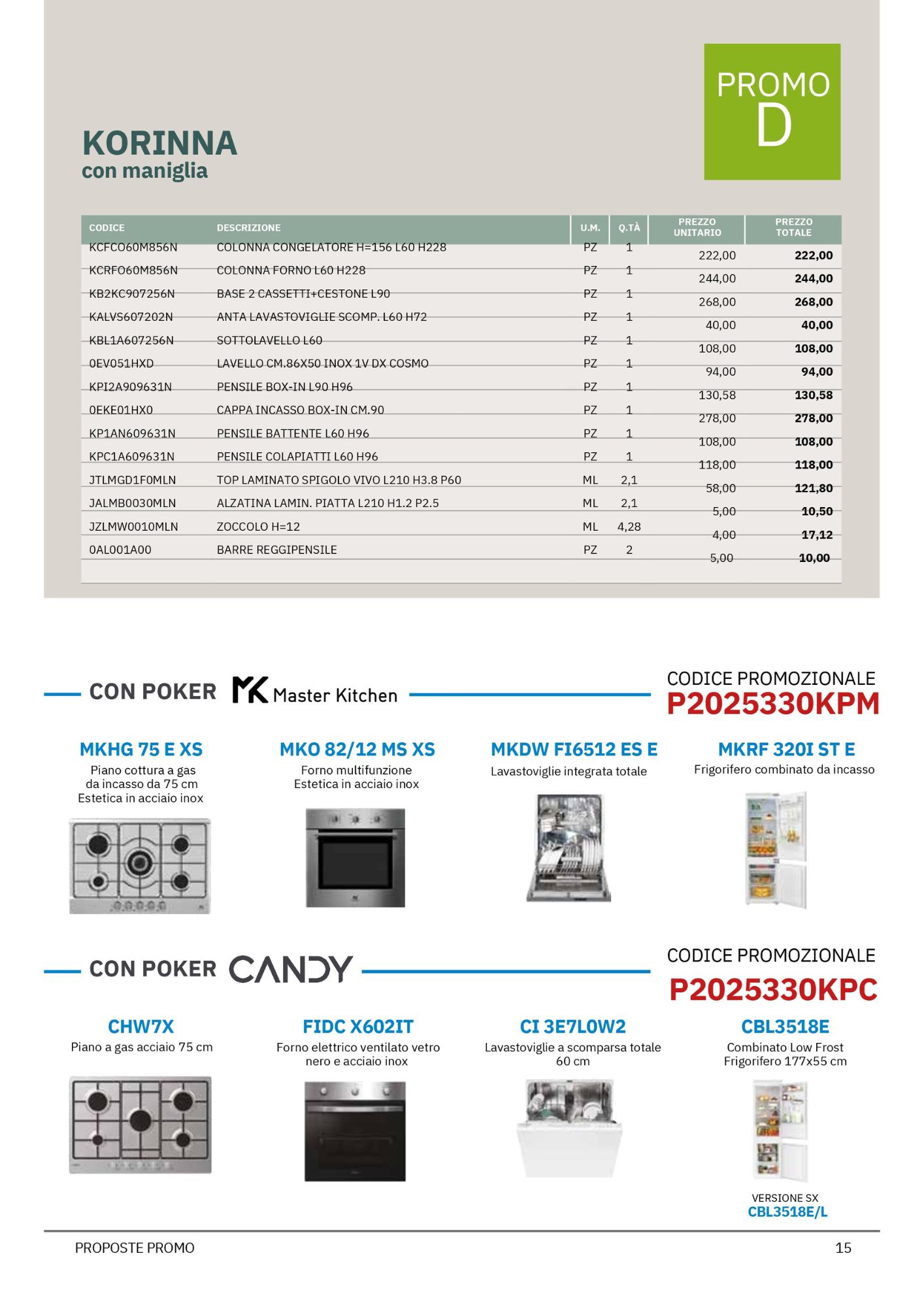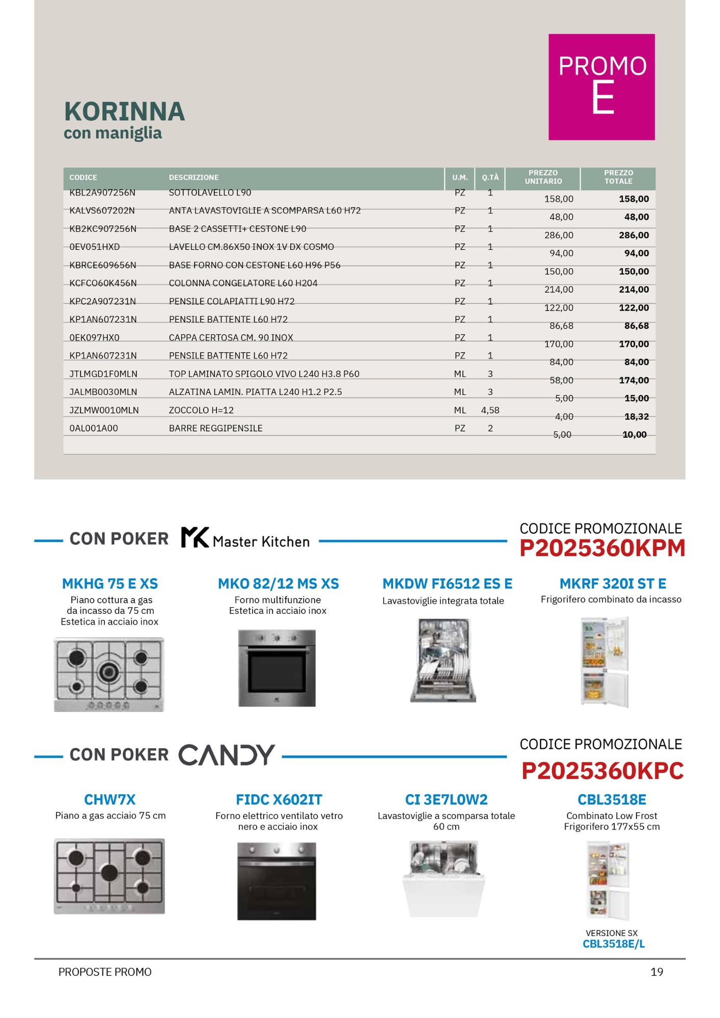 Da Mobili Rossetti, rivenditore Evo Cucine, puoi approfittare di offerte speciali su quattro modelli bloccati Evo, suddivisi tra due linee principali: Korinna e Rio, ciascuna proposta in due varianti (Promo D e Promo E), per rispondere a diverse esigenze di spazio e stile.