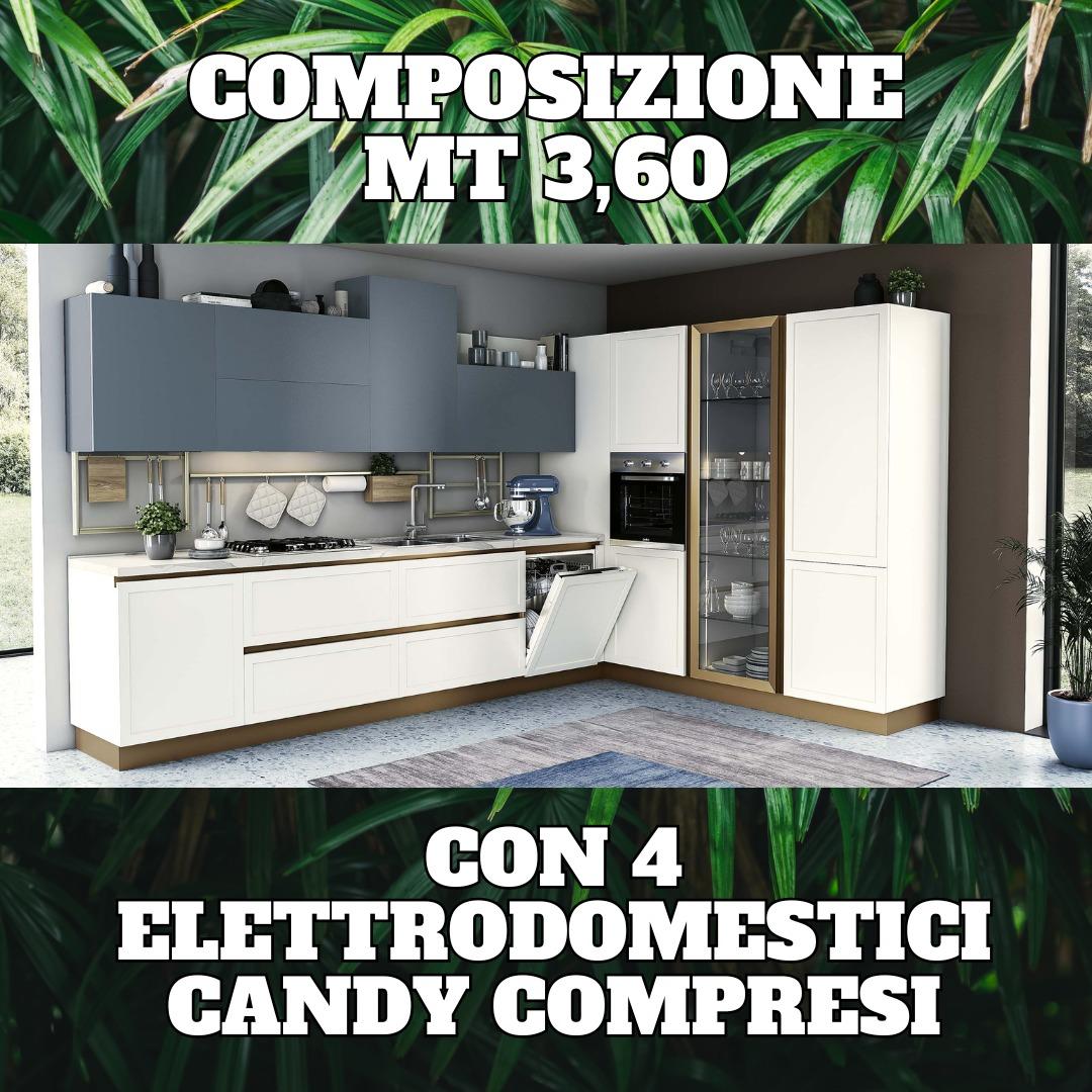 Mobili Rossetti ti propone Cucina Evo modello Bali in offerta con 4 elettrodomestici Candy compresi: forno, piano cottura, frigo e lavastoviglie.