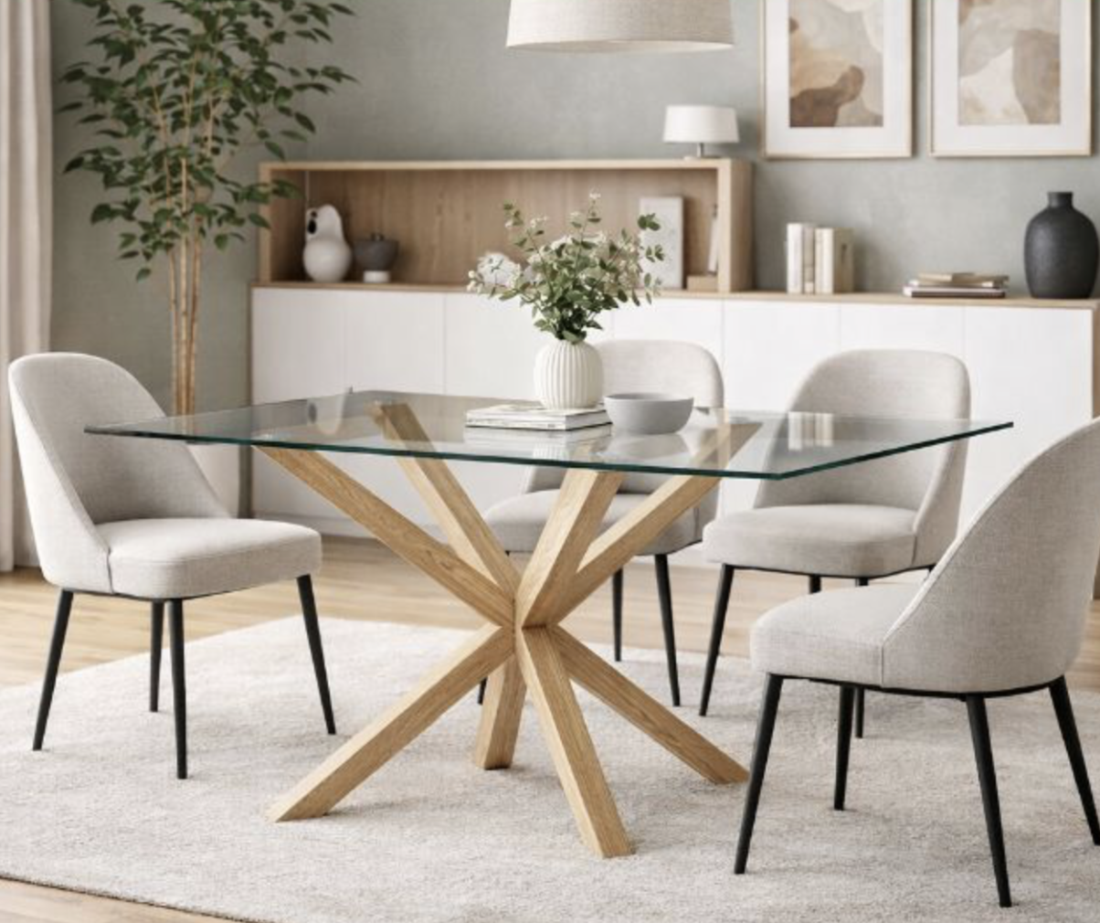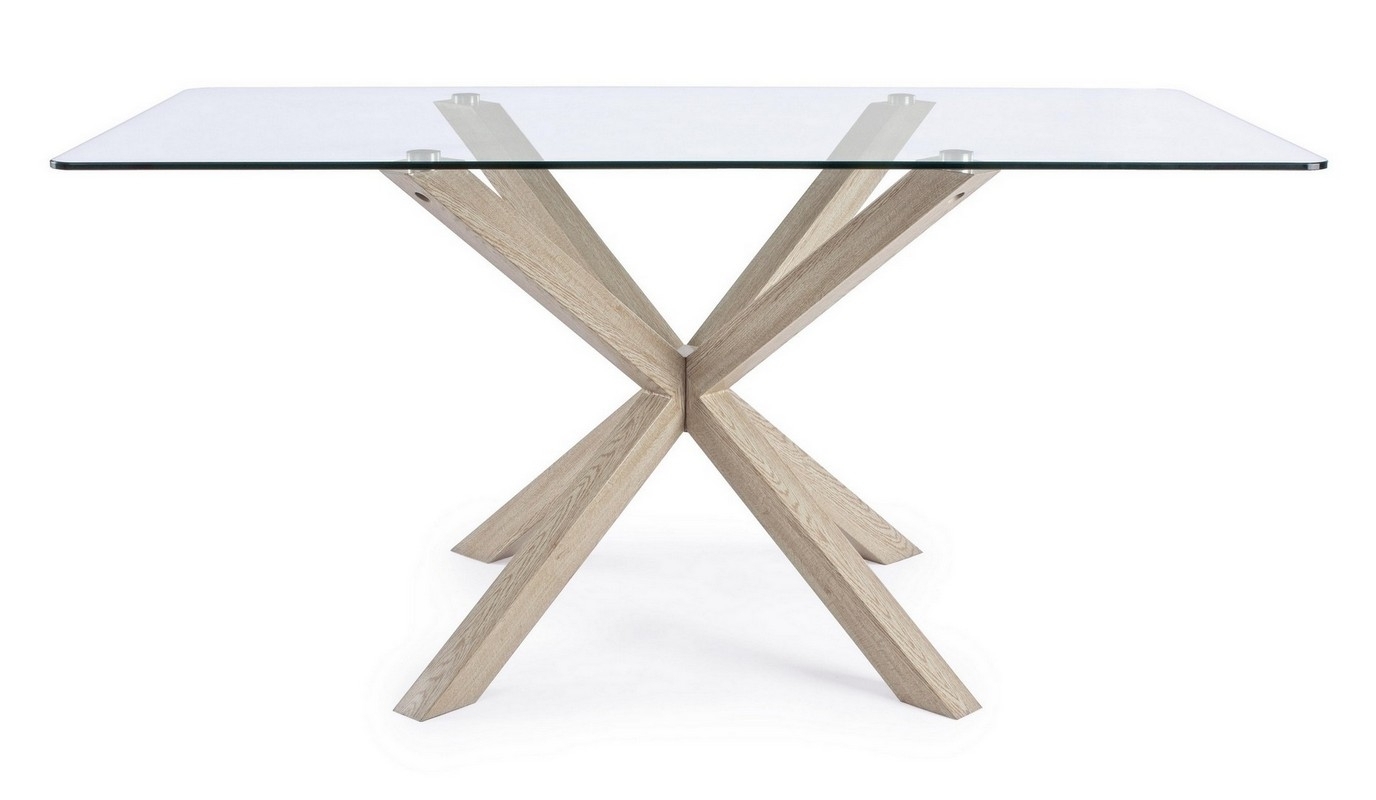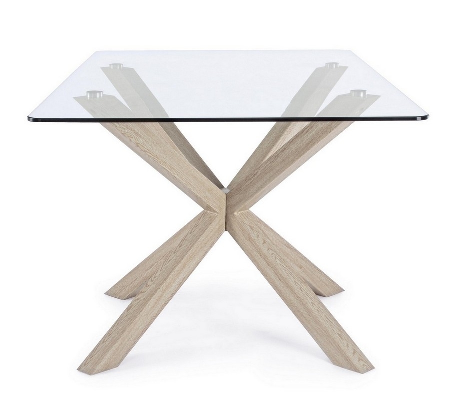 Tavolo in vetro modello May fisso. Gambe in acciaio verniciate a polvere epossidica colore legno naturale piano in vetro temperato spessore 10mm.
