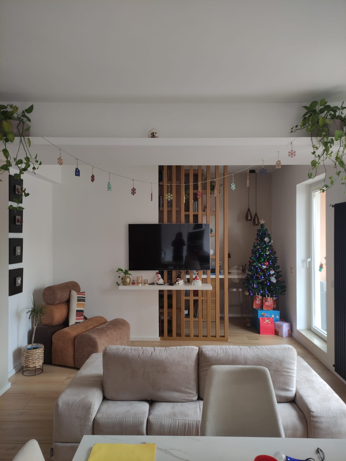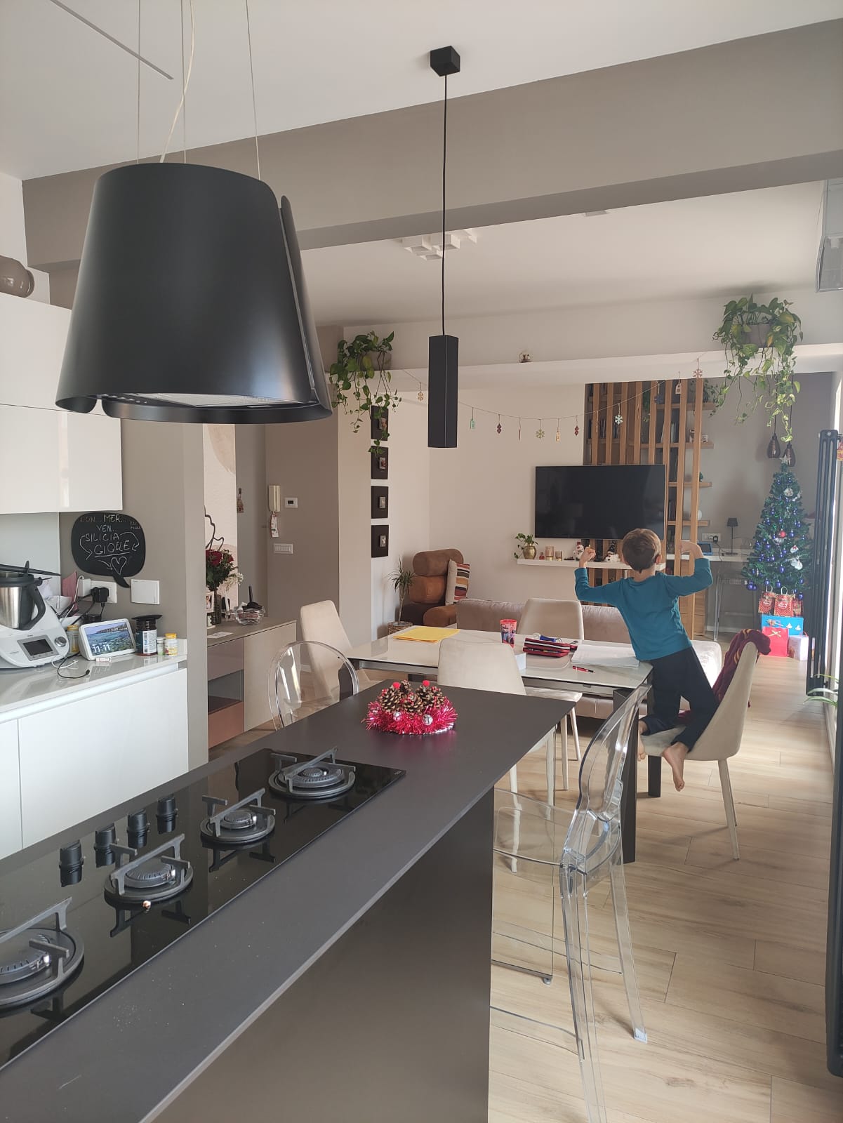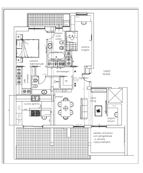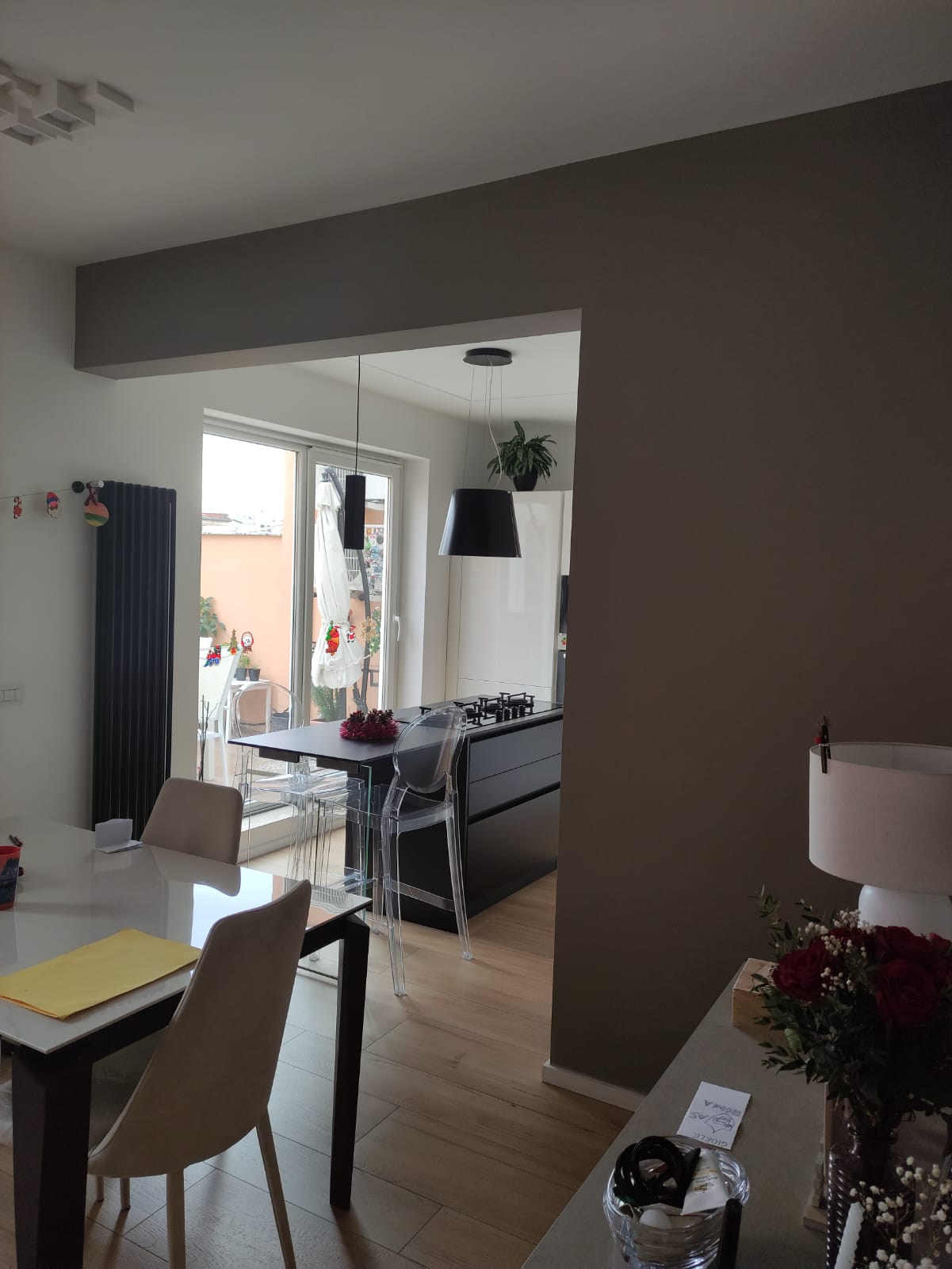 Un tradizionale appartamento si trasforma in un raffinato piccolo loft, dove gli spazi vengono rimodulati per dare massimo respiro alla zona giorno. L’open space con cucina a vista diventa il cuore della casa, collegato al terrazzo con pergotenda e vetrate scorrevoli che creano un vero e proprio “salotto d’inverno”.